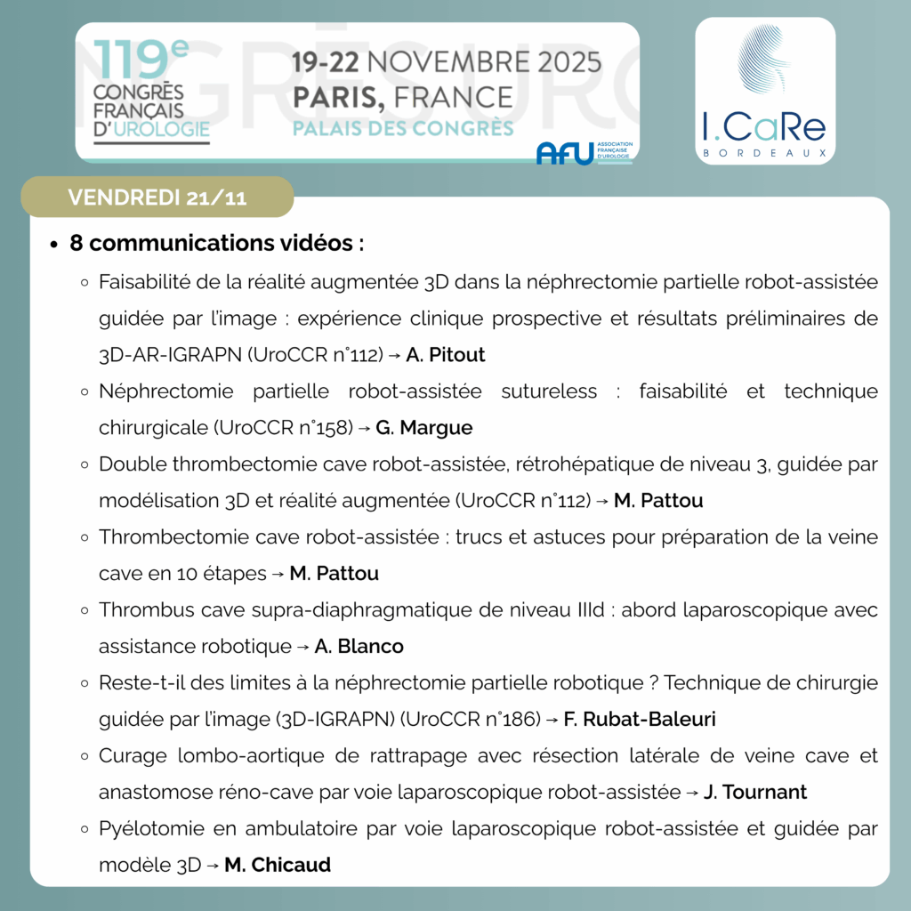 – Faisabilité de la réalité augmentée 3D dans la NPRA guidée par l’image : expérience clinique prospective et résultats préliminaires de 3D-AR-IGRAPN (UroCCR n°112), Dr Alice PITOUT